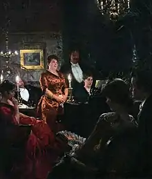 Krøyer had visited the atelier where Marie was studying on several occasions, but the first of his works in which she appears is A Duet, painted in Heinrich Hirschsprung's Copenhagen home in 1887 where she had been invited to model for him. She can be seen seated on the left of the painting in a red dress.[5][6]