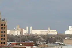 Enid experienced a "golden age" following the discovery of oil in the region in the 1910s and continuing until World War II.[15] Enid's economy boomed as a result of the growing oil, wheat, and rail industries, and its population grew steadily throughout the early 20th century in conjunction with a period of substantial architectural development and land expansion. Enid's downtown had the construction of several buildings including the Broadway Tower, Garfield County Courthouse, and Enid Masonic Temple. In conjunction with the oil boom, oilmen such as T. T. Eason, H. H. Champlin, and Charles E. Knox built homes in the area. Residential additions during this period include Kenwood, Waverley, Weatherly, East Hill, Kinser Heights, Buena Vista, and McKinley.[16] Union Equity, Continental, Pillsbury, General Mills, and other grain companies operated mills and grain elevators in the area, creating what is now the Enid Terminal Grain Elevators Historic District,[17] and earning Enid the titles of "Wheat Capital of Oklahoma", "Queen Wheat City of Oklahoma," and "Wheat Capital of the United States"[1]
