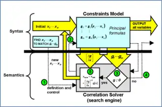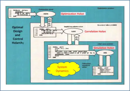 Yet semantically, this mathematical blending was considerably more complex than the mechanics of subroutines because an iterative solution engine was attached to each problem model by its calling operator template above it in the program hierarchy. In its numerical solution process, this engine would take control and would call the problem model subroutine iteratively, not returning to the calling template until its system problem was solved. During some or maybe all of the iterative model-subroutine calls, the engine would invoke automatic differentiation of the formulas in the model holarchy with respect to the model's input-unknowns (arguments) defined in the calling template. Additional mechanisms were performed in the semantics to accommodate ubiquitous nesting of these holistic models.