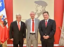 José Kozer receiving the award in 2013, together with former President Sebastián Piñera (left) and minister Roberto Ampuero (right)