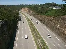 The route between Mount White and Kariong was originally planned to be further south than the route as built, with an easier crossing of Mooney Mooney Creek.[8] By the time that construction on this section was to begin, resistance from the National Parks & Wildlife Service to the proposed route forced the Department of Main Roads to take a route through Calga, using part of the first stage of a proposed freeway route to Singleton which had been built the 1960s. That scheme has never been further developed.