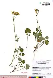 Packera bolanderi is a species of flowering plant in the aster family known by the common names Bolander's ragwort and seacoast ragwort. It is native to the west coast of the United States from Washington to northern California, where it grows in wet coastal forests and woodlands. There are two varieties of the species which differ slightly in morphology and habitat occupied; these varieties have been considered separate species by some authors.[1] The var. bolanderi has thicker leaves, occurs farther south (into California), and occupies more open types of habitat, than does var. harfordii.[1] This plant in general is a perennial herb producing one to three stems up to half a meter tall. The basal leaves have blades up to 12 centimeters long which are divided into several lobes and borne on long, thin petioles. Leaves growing farther up the stem are smaller and have more lobes on their blades. The inflorescence contains several flower heads, each lined with dark green phyllaries. The head contains many golden yellow disc florets and generally either 8 or 13 yellow ray florets each over a centimeter long. The fruit is an achene tipped with a pappus of bristles.