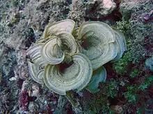 Padina inhabits tropical regions, although the genus can also be found in cooler temperate waters from South America to Southeast Asia. The genus is distinguishable because of its characteristic shape resembling a peacock tail structure.[5] It can be found a wide range of habitats, ranging from intertidal to subtidal zones. Padina are found to be more prolific in clear waters at a depth of 15–20 m but can be seen up to 110 m in depth, attached to hard substrates or growing as epiphytes on larger seaweeds (e.g. Sargassum).[5] Padina in the Indian Ocean have a much more narrow distribution, in specific localities compared to those in the Pacific with a distribution that is much more overlapping within regions[1]