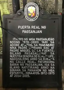 Under the supervision of a Franciscan priest, Fray Cipriano Bac and Don Manuel de Yriarte, the Pagsanjan Arch was built from 1878 to 1880 by the town people through forced labor or polo y servicio.[1] It was also known as Puerta Real or Royal Gate during the Spanish and American occupation.