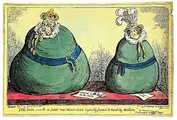 George lived a hugely extravagant life on the taxes collected by Parliament, whereas Caroline appeared to live modestly.[12] Satirists and cartoonists published prints in support of Caroline and depicted George as debauched and licentious.[13] She received messages of support from all over the country. Caroline was a figurehead for the growing radical movement that demanded political reform and opposed the unpopular George.[14] By August, Caroline had allied with radical campaigners such as William Cobbett, and it was probably Cobbett who wrote these words of Caroline's:[15]