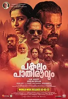 Pakalum Paathiravum is a 2023 Indian Malayalam-language neo-noir action thriller film directed by Ajai Vasudev, starring Kunchacko Boban, Rajisha Vijayan and Guru Somasundaram in lead roles. The film is a remake of the 2018 Kannada film Aa Karaala Ratri.[2] The film had its theatrical release on 3 March 2023.[3] Subsequently, it was made available to stream on ZEE5 on 28 April 2023.[4] The film received mixed reviews.