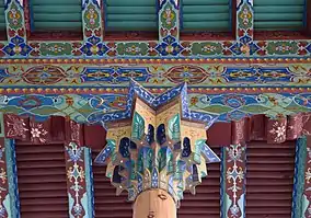 The entire facade is richly tiled, with a mixture of geometric patterns and inscriptions. Above the gateway, an Arabic inscription reads “High Palace of Seid Muhammad Khudayar Khan”.[2] The use of yellow and green in the colour scheme makes this building distinct (and dates it later) than the mostly blue and turquoise monuments found elsewhere in Uzbekistan.