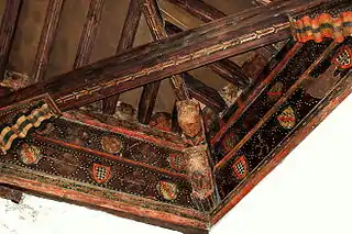 In the main hall on the second floor, small polychromes are preserved in the wooden coffered ceiling, while in the main hall, on the second floor, the remains of a splendid polychrome and carved coffered ceiling are preserved, which was restored in 2006 through an agreement between the Junta of Castile and León and the City Council of Cuéllar, with a budget of 81,996 euros at 50% each.[8]