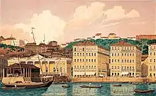 The structure of the Palace of the Commercial Association of Bahia was built on the ruins of the São Fernando Fort, which was demolished between 1814 and 1816.[7][4] The construction was financed by the former governor of Bahia, Dom Marcos de Noronha e Brito, VIII Count of Arcos, and architecturally designed by Portuguese architect Cosme Damião da Cunha Fidié. It was planned by the Commercial Association of Bahia (ACB) to serve as a headquarters for events, dinners, and meetings among the merchants and inaugurated on January 28, 1817, in a solemn act.[8][9][1] Its location was also determined by the governor. In the current building, part of the structure of the old fortress can still be found.[7]