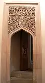 Near the shah's mosque in the lower courtyard, in the wall separating the lower platform from the upper one, is located the building of the Shirvanshahs burial vault, the so-called "Turbe". This building is located directly opposite the entrance, overlapped by a pointed vault. Smooth wall of the facade is lined with Baku limestone with a careful fit of the seams. Above the building, there is a richly decorated portal to the tomb. This portal repeats the compositional reception of the Divan-khan portal, but in comparison with the latter it is somewhat easier to interpret (the stalactite arch consists of only four rows of stalactites, the side walls are smoothly solved, no niches,[26] and only tympanum of the arches, a number of inscriptions in the font "nash" – Koranic (Surah XII, verse 92nd) and hadith.[17]