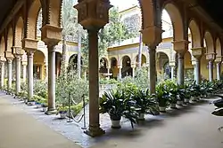 The courtyard garden, divided into four parts in keeping with its traditional Islamic style, includes tiled paths and a centralized raised fountain.[8] The palace garden's lemon trees and fountain are recurring symbols in Machado's poetry.[9] Behind the garden is a courtyard surrounded by arches with columns of white marble. The arch situated west of the courtyard in the lower galleries gives access to the building that was used as chapel. The 15th-century chapel has fared badly during restorations.[1] The altar contains several tiles with metallic reflections, typical of 16th-century Seville ceramics.
