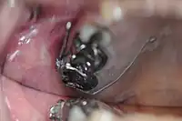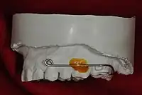 Buccal view of an interim palatal lift prosthesis master cast with an orthodontic wire clasp bent to engage an orthodontic bracket affixed to tooth number 15