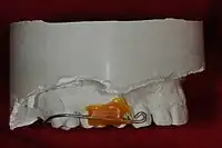 Buccal view of an interim palatal lift prosthesis master cast with an orthodontic wire clasp bent to engage composite resin affixed to tooth number 15