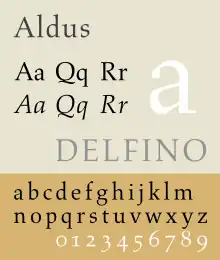 Aldus is an old-style serif design, popular for use in book printing. Compared to Palatino, released some years earlier, it has a more condensed design lighter in colour, more graceful and refined and better suited to the high average quality of book printing.[13][20] Aldus has a non-kerning roman and italic f, allowing the typographer to avoid ligatures. It appeared in the D. Stempel AG catalog in 1954 and Zapf used it to set his own Manuale Typographicum, a history of letter design.[21]