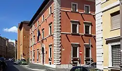 The Alicorni, an Albanian family, had escaped from their homeland during the reign of Pope Pius II (r. 1458–64), because of the Ottoman advance in their country.[3][4] They settled first in Milan, then in Pavia, Forlì, and finally in Rome.[3][4] They rose to high rank, partly because of several marriages with Italian noble families; among them were the Trivulzio and Pusterla from Milan, and the Capranica from Rome.[3][4] Messer Traiano (also spelled Trajano) Alicorni, conservatore (one of the three counselors) of the city and primo cameriere of the pope, had his palace erected in Borgo at the beginning of the 16th century.[3][4][5] The palace originally had its main facade along the Borgo Vecchio road.[4] Two inns, named respectively Locanda del Leopardo and Locanda dell'Inferno (The Leopard and The Hell), had to be demolished to make room for the new building.[3][4][6][7] Trajano Alicorni left two sons, Giovanni Battista and Fabio, who were both appointed knights by the Pope.[3][4] In 1585, Giovanni Battista sold the palace to the French Cardinal Matteo Contarelli, Datarius of Pope Gregory XIII (r. 1572–85).[4][8] Some months later the prelate died, leaving the palace to his heirs, who sold it again to others who neglected the building, which fell into disrepair.[8][9] In 1667, the erection of the Colonnades of St. Peter's square by Gian Lorenzo Bernini made it necessary to pull down the last block of houses ("isola") in front of the new square: this was named "isola del Priorato", since one of the buildings hosted the Priory of the knights of Rhodes.[9] After the erection of the new square, Palazzo Alicorni faced at a very short distance the southern Colonnade in an incongruous position, being isolated on three sides, with Piazza Rusticucci (the new vestibule of St. Peter's square, created through the demolition) to the north, via del Sant'Uffizio to the west, and the short, crooked lane named "Vicolo di Messer Traiano" (from Traiano Alicorni) to the east.[8][9][10]