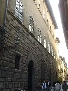 The two brother Alessandro and Bartolomeo degli Albizi (after 1372 called 'degli Alessandri') built the palace after the purchasing of three lots between 1368-72 and probably completed by 1376. During the Ciompi rebellion of 1378 the palace was ransacked and arson, the west side of the structure collapsed (the lack of rustication is still visible today).[1] The Alessandri (and Albizzi) had been prominent Guelf families linked to the wool production, and thus the Guild of Wool. The coat of arms of the Alessandri was a two heads lamb on a blue field with a gold crown and palm leaves. The family produced twenty-three Priors and nine Gonfaloniers. The palace was enlarged in the 1700s by Cosimo Alessandri.[2] The palace was restored in the 19th century by Giuseppe Poggi. Antonio Canova was patronized by the Alessandri family. The Palace is still owned by descendants of the Alessandri.