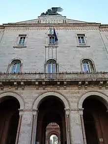 The Palazzo della Provincia e della Prefettura of Perugia has been built, by the municipal administration, to fill the empty space due to the demolition of the Rocca Paolina; it has therefore its bases above the ruin of the Rocca. Originally the purpose of this public building was not defined, it was thought for the Academy of Fine Arts;[1] for this reason It had an anonymous name: “Palazzo Nuovo” (New Palace) or “la Fabbrica di Mezzo” (the factory in the centre) because it was built in the central area occupied by the Rocca's ruins, where others private buildings were built immediately afterwards.