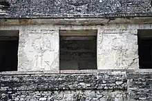 The Temple of the Cross, Temple of the Sun, and Temple of the Foliated Cross are a set of graceful temples atop step pyramids, each with an elaborately carved relief in the inner chamber depicting two figures presenting ritual objects and effigies to a central icon. Earlier interpretations had argued that the smaller figure was that of K'inich Janaab' Pakal while the larger figure was K'inich Kan B'ahlam. However, it is now known based on a better understanding of the iconography and epigraphy that the central tablet depicts two images of Kan B'ahlam. The smaller figure shows K'inich Kan B'ahlam during a rite of passage ritual at the age of six (9.10.8.9.3 9 Akbal 6 Xul) while the larger is of his accession to kingship at the age of 48.[19] These temples were named by early explorers; the cross-like images in two of the reliefs actually depict the tree of creation at the center of the world in Maya mythology.