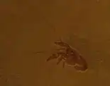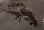 - Related to the Ammonite fauna, on Holzmaden there have been found several empty shells of this cephalopods, with associated crustaceans inside.[6] The original specimen was reported in 1995 and consisted on a possible member of the genus Paleastacus inside a chamber of a Harpoceras.[6] Other epizoans are found related to the decayed Ammonite shells, such as Serpulid Annelids and Bivalves, creating what was denominated as "benthic islands" as reference at be isolated benthic units that attracted fauna.[6] The Decapod is related to the family Erymidae, that are considered as possible bottom-dweller carnivorous or carrion feeders.[6] The associated fossil has several spherical structures that had been interpreted as decapod coprolites, implying that the animal lived for a long period on the shell, and maybe changes on the bottom oxygen stopped the process.[6] More recent studies had recovered new data about the inquilinism of decapods inside ammonites, this time, however, recovering three Eryonoidea lobsters together within a body chamber.[7] The lobsters most likely used the ammonoid as some kind of shelter, where was excluded the possibility of transportation into the body chamber by bottom currents.[7] There are several theories about the gregarious inquilinism showed by this specimens, such as that the shell was and ideal location to molt, as has not been proved to be corpses or molts; that the shell provided protection against predators; the decomposing soft body of the ammonoid was a source of food that attracted the decapods or that was used as a long-term shelter.[7] One key aspect found was that the muddy bottom was not suitable for burrowing, implying that the decapods look for a different shelter due to being unable to make their own.[7]