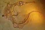 - The genus Clarkeiteuthis and its predatory behaviour, found associated with fishes of the genus Leptolepis.[9] Based on the position of prey and predator, was suggested that the coeloid cephalopods caught and killed the fishes while the schools still in well-oxygenated waters and then descended into oxygen-depleted water layers where the cephalopod suffocated and died attached to its prey.[9] The fish measured 12 centimetres (4.7 in), while the coeloid 21 and it was measured by the fossilized arms of 14 specimens of coeloids that the hunting specimens arms where contracted over the fish, probably quickly killing it by cutting its spine.[9]