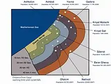 During the Gaza War, Palestinian militants began to deploy improved Qassam and factory-made rockets with a range of 40 kilometers.[85] Rockets reached major Israeli cities Ashdod, Beersheba and Gedera for the first time, putting one-eighth of Israel's population in rocket range[86] and raising concerns about the safety of the Tel Aviv metropolitan area, Israel's largest population center,[87][88] as well as the Negev Nuclear Research Center.[89] According to Israeli authorities, 571 rockets and 205 mortar shells landed in Israel during the 22 days of the conflict.[29]