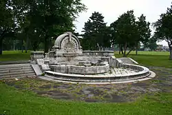 The Merrill Fountain was designed by the architectural firm of Carrère and Hastings and originally stood in front of the old Detroit Opera House in Campus Martius Park. Built in 1904 at a cost of US$1,000,000 (equivalent to $32,570,370 in 2022),[5] it was named for Charles Merrill and dedicated by his daughter, Elizabeth Palmer.[4][14][15] As automobile traffic increased in downtown Detroit, the city's elders decided to move the fountain to the Merrill Plaissance, at the far southern boundary of Palmer Park, in 1926.[16] The fountain functioned for one season in the park and then pipes broke.[6] It has been dry for over 50 years and suffered from theft of pieces and destruction by vandals.[17]