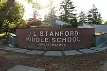 Jane Lathrop Stanford Middle School, formerly Ray Lyman Wilbur Junior High School and known locally as JLS,[5] is located at 480 East Meadow Dr., Palo Alto, CA 94306.[27] The school mascot is the panther.