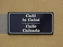 Calli la Calzá, a street in Robleda, labelled in Palra and Spanish