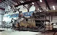 All parts of the recovered aircraft were taken initially to a hangar at Longtown, Cumbria, where they were examined by investigators from Britain's AAIB; they were then moved to the AAIB's headquarters at Farnborough Airfield in Hampshire for the fuselage of the Boeing 747 to be partially reconstructed. Investigators found an area on the left side of the lower fuselage in the forward cargo hold, directly under the aircraft's navigation and communications systems, where a small section of about 20-inch (0.51 m) square had been completely shattered, with signs of pitting and sooting. The fuselage skin had been bent and torn back in a so-called starburst pattern—petalled outwards—a pattern that was evidence of an explosion.