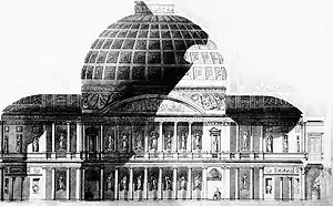 There is general agreement that the scheme of the great room, or rotunda, was derived from Santa Sophia in Istanbul.[1] The central space was contained in a square of 60 feet (18 m) topped by a coffered dome. On the east and west sides were superimposed colonnades of seven bays, screening the aisles and first floor galleries. At the north and south end there were short arms, 40 feet (12 m) wide, terminating in shallow segmental apses. The architectural elements and decorations were strictly Roman in inspiration. Below the rotunda there was a tea and supper room, of the same shape but divided into five aisles by the piers supporting the floor above.[2]
