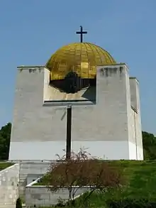 The Pantheon of National Revival Heroes (Bulgarian: Пантеон на възрожденците) is a Bulgarian national monument and an ossuary, located in the city of Rousse. The remains of 39 famous Bulgarians are interred there, including: Lyuben Karavelov, Zahari Stoyanov, Stefan Karadzha, Panayot Hitov, Tonka Obretenova, Nikola Obretenov, Panayot Volov, Angel Kanchev, and others; 453 other participants in Botev's detachment, the Chervena Voda detachment, in the April uprising, and other revolutionaries have been honored by inscription of their names in the interior. An eternal fire burns in the middle under the gold-plated dome. The Pantheon is one of the 100 Tourist Sites of Bulgaria.