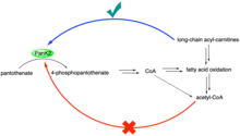 Because PanK2 is so strongly inhibited by acetyl-CoA, an abundant metabolite in the mitochondria, this enzyme likely would not be active under physiological conditions without activators.[6] Palmitoyl-carnitine and other long-chain acyl-carnitines can reverse acetyl-CoA inhibition and can activate PanK2 without acetyl-CoA present. Palmitoyl-carnitine is competitive with acetyl-CoA.[20] The activation of PanK2 by palmitoyl-carnitine and other long-chain acyl-carnitines sheds light on the regulatory pathways of this enzyme: Under normal conditions, PanK2 is likely inhibited by high levels of acetyl-CoA. Without CoA production, fatty acid oxidation decreases, leading to an increase in long-chain acyl-carnitines.[19] These acyl-carnitines can then reduce inhibition by acetyl-CoA, activating PanK2 and increasing CoA biosynthesis. PanK3 is also activated by palmitoyl-carnitine and other long-chain acyl-carnitines, including oleoyl-carnitine.[21]