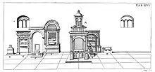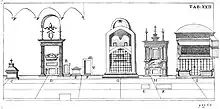 Very little is known about the placement and appearance of the original tombs: one of the most valuable accounts is that of church canon and historian Giacomo Grimaldi (a senator of Genoa and the father of Girolamo Grimaldi-Cavalleroni), who sketched the tombs as they were moved around the basilica on the way to their destruction;[4] Grimaldi's sketches record the shape and complexity of the early tombs, many of which were three-tiered.[2] A few destroyed papal tombs are also detailed in the writings of Alphonsus Ciacconius.[5]
