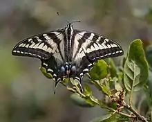 Papilio eurymedon, the pale swallowtail or pallid swallowtail, is a relatively common swallowtail butterfly found throughout much of the western North America. The species was first described by Hippolyte Lucas in 1852. It is found on the Pacific coast from northern Baja California to southernmost British Columbia, and inland to New Mexico and the Black Hills of South Dakota. It is present from the coast to western Montana, and from Wyoming to northern New Mexico. It is absent from most of Nevada and western Utah. It prefers open woodlands and forest clearings, especially near permanent bodies of water such as ponds, but also urban parks and is occasionally seen in suburban areas. Though not as common as the western tiger swallowtail, the pale swallowtail can be seen in large numbers at puddling parties where up to a dozen or more males may be gathered. There they join other species to sip water from damp soil to obtain nutrients for mating. Their appearance is quite similar to that of the western tiger swallowtail, except they are a white-cream color or very pale yellow. Some pale swallowtails also have differing amounts of red-orange patches on the top of the wings just above the tail. There is a submarginal band on the bottom of the hindwings. Tiger stripes and borders are thicker than those of western tiger swallowtails. The wingspan is typically 3.5 to 4.5 inches (8.9 to 11.4 cm).