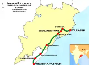 The 22809 / 10 Paradeep–Visakhapatnam Express runs from Paradeep via Cuttack Junction, Khurda Road Junction, Vizianagaram Junction to Visakhapatnam.