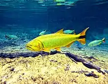 The Paraguay River ecoregion has high species richness with about 350 fish species, including more than 80 endemics.[9] About 80% of the fish species in the river are characiforms (tetras and allies) and siluriforms (catfish).[9] Several of these migrate up the Paraguay River to spawn, including Prochilodus lineatus and Pseudoplatystoma corruscans.[9] Unsurprisingly many species in the river are essentially of Paraná River Basin origin, but the fauna also has a connection with two Amazonian rivers, the Guaporé and Mamoré. While flowing in different directions, the Paraguay, Guaporé and Mamoré all have their source in the same region in central South America. Among the species shared between these are the black phantom tetra, an important fish in the aquarium industry,[10] and the golden dorado, which is important in the fishing industry.[11][12]
