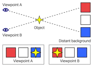A simplified illustration of the parallax of an object against a distant background due to a perspective shift. When viewed from "Viewpoint A", the object appears to be in front of the blue square. When the viewpoint is changed to "Viewpoint B", the object appears to have moved in front of the red square.