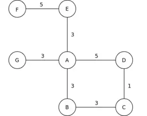 Following is a step by step description of the algorithm execution for a small example graph. The source vertex is the vertex A and the radius of every vertex is equal to 1.
