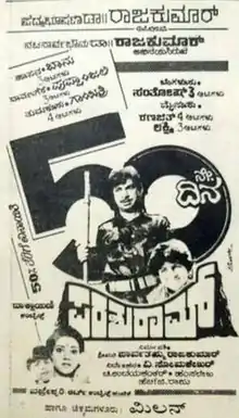 Parashuram is a 1989 Indian Kannada action thriller film directed by V. Somashekar and produced by Parvathamma Rajkumar. The film starred Rajkumar, Mahalakshmi and Vani Viswanath.[1] This was V. Somashekhar's last movie with Rajkumar, who incidentally started his directing career with Rajkumar's Bangaarada Panjara (1974). Also this was last movie of Puneeth Rajkumar as a child actor,[2] who later returned as a fully fledged hero in the movie Appu (2002). The film's score and soundtrack was composed by Hamsalekha.[3]
