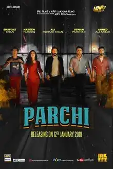 Parchi (Urdu: پرچی, transl.Chit) is a 2018 Pakistani Urdu-language crime comedy film directed by Azfar Jafri and produced by Imran Kazmi and Arif Lakhani under the banner IRK Films.[3] The film stars Hareem Farooq, Ali Rehman Khan and Shafqat Cheema,[4] with Ahmed Ali Akbar, Faiza Saleem, Shafqat Khan and Usman Mukhtar in supporting roles. Khan also wrote film whilst Usman Mukhtar managed cinematography; Farooq also produced the film.[5] It was released and distributed by ARY Films on 5 January 2018.