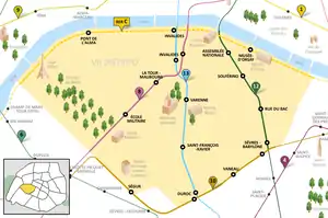 ![]() View of the Eiffel Tower and Les Invalides, two landmarks of the 7th arrondissement | |