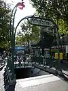 Three of the entrances took the form of free-standing pavilions or small stations,[5] including waiting rooms: one at Bastille and two on Avenue de Wagram at Étoile. These were in a style influenced by Japanese pagodas. At Étoile Guimard provided exterior doors for elevators, although the elevators were not built.[10] Eight simpler but still elaborate structures, labeled "Édicule B" by Guimard, were installed at the termini of Line 1 as originally opened and at two other major stations. These consisted of three-sided glass-roofed structures enclosing the stairway, with a projecting canopy.[10][11][12] A variation on this format, "Édicule A", lacked the canopy and was erected at two stations, Saint-Paul and Reuilly – Diderot.[10] These édicule types of entrance, which have come to be called libellules because they resemble dragonflies, in some cases had decorated wall panels surfaced in reconstituted lava.[11] The great majority of the entrances built (154) were unroofed enclosures, dubbed an entourage. A transitional form between the entourage and the édicule, railings with a roof and canopy, was used for one entrance at the Gare de Lyon métro station.[13]