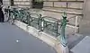Rather than stone, Guimard used cast iron set in concrete both to reduce costs and to suit the sinuous Art Nouveau forms;[3][6] they were painted in a green emulating weathered brass.[7] (For a renovation that began in 1999, the RATP, the Paris transportation authority, restored the entrances to two slightly different shades: at sites with a lot of vegetation, vert wagon ('train-car green'), the dark green used for Parisian public works at the turn of the 20th century, and at fully urban sites, a slightly bluer shade, vert allemand ('German green').[8]) He designed standardized components, including railing cartouches incorporating the letter "M" and signs in his own distinctive lettering reading "Métropolitain" or, at narrow entrances, "Métro"; later the use of the lettering was extended to a holder for a system map and for advertising (porte-plan) with the station name above. In addition to speed (the first set of entrances were installed within six months of their design)[9] and relatively low cost in manufacture and adaptation to different sizes and locations of entrances, all of this gave the system a stylistic identity.[6][10]