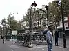 However, critics and many of the public were hostile to the libellules in particular, and criticized the green as "German" and the lettering as "un-French"[6] and, according to critic André Hallays in Le Temps, "confus[ing to] little children who are trying to learn their letters and ... stupefy[ing to] foreigners".[21] On the Champs-Élysées, for example at Marbeuf (now part of Franklin D. Roosevelt), simple stone walls with discreet carved signage were used instead,[10] and a plain design was also used at Bourse.[22][23] Unhappiness with Guimard's 1904 design for the Opéra station,[24] described in Le Figaro as having "contorted ramps" and "enormous frog-eye lamps",[25] and increasing costs led to the CMP severing its relationship with him.[5][22] The entrance at Opéra was instead designed by Joseph-Marie Cassien-Bernard, in classical marble.[22][25] The CMP bought Guimard's molds and rights[22] and a total of 141 of his entrances were ultimately produced, the last in 1913.[20]