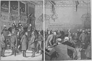 The end of the Commune left the city's population deeply divided. Gustave Flaubert described the atmosphere in the city in early June 1871: "One half of the population of Paris wants to strangle the other half, and the other half has the same idea; you can read it in the eyes of people passing by." [2] This sentiment soon became secondary to the need to reconstruct the buildings that had been destroyed in the last days of the Commune. The Communards had burned the Hôtel de Ville (including all the city archives), the Tuileries Palace, the Palais de Justice, the Prefecture of Police, the Ministry of Finances, the Cour des Comptes, the State Council building at the Palais-Royal, and many others. Several streets, particularly the Rue de Rivoli, had also been badly damaged by the fighting. Besides the cost of reconstruction, the new government was obliged to pay an indemnity of 210 million francs in gold to the victorious German Empire as reparations for the disastrous Franco-Prussian War of 1870. On 4 August 1871, at the first meeting of the city council after the Commune, the new Prefect of the Seine, Léon Say, put forward a plan to borrow 350 million francs for reconstruction and indemnity payments. The city's bankers and businessmen quickly raised the money, and the reconstruction was soon underway.