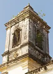 The Parish Church of Santiago do Iguape was constructed of mixed masonry of stone and brick. Its frontispiece is "extremely elegant"[1] and is in the rococo Dona Maria I style. It is divided by sandstone pilasters, five portals superimposed by five windows at the choir level. The portals and windows are framed in lioz stone imported from Portugal; they have elaborate garland decoration borders. The facade is surmounted by an ornate baroque-style pediment. The church has two bell towers with gables at each side of the pediment. The bell gables have bulbous towers covered in glazed china fragments and azulejos, a feature found in numerous churches in Salvador and Recôncavo region.[3]