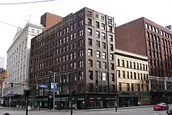 Nine stories tall, the Park Building abuts a four-story building to the south and the taller May Company Building to the rear; the side facing Public Square is several times the length of the Ontario Street-facing front. The walls are primarily brick, covered with an asphalt roof and resting on a concrete foundation.[2] Concrete construction is a distinguishing feature of the architecture; the Park Building was one of Cleveland's earliest office towers with floors constructed of reinforced concrete.[3] This usage reflects the tastes of the architect, Frank Seymour Barnum, one of the region's pioneers of twentieth-century architectural methods.[4] Among its architectural details are large bay windows with bronze and granite components, floors mixing terrazzo with stone, and carefully formed woodwork.[5]