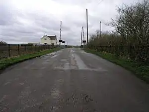 A passenger station opened on 2 March 1896,[1] and the 1899 map shows two platforms to the east of the level crossing. Two buildings had appeared just to the north, on the other side of the Warping Drain to the station. The station and the buildings were only just in Nottinghamshire, as the county border with Lincolnshire ran diagonally across the countryside, crossing the railway about half way along the eastern siding.[6] The building nearest the road was the Park Drain Hotel, which was completed in 1899 by George Dunston, a local colliery proprietor and mining engineer. He had obtained a licence to serve alcohol in 1897, before construction had begun, which was granted on the basis that Park Drain would soon be the centre of an extensive coal mining operation.[7] Coal had first been discovered in the vicinity when exploratory drilling had taken place at Idle Stop in 1893. Two seams were found, at depths of 3,142 feet (958 m) and 3,185 feet (971 m),[8] A newspaper report of a dinner held by Dunston at the hotel in 1899 noted that the station served the people of Westwoodside, but that the hotel stood in a remote location, with only some railway men's cottages and a signal box nearby. It is unclear whether the station was in full operation at that time, since Dunston, in a speech which outlined plans for a mine and a large village or small town near the hotel, also mentioned that a number of his friends were missing from the dinner because the railway company would not stop the train on which they were travelling at Park Drain.[9] The scheme to open a mine foundered when the First World War began, and there were also issues with drainage. Despite its isolated location, the hotel flourished until the 1990s, when it closed, and in 2003 the building was re-used as offices.[10]