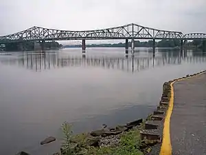 The Parkersburg–Belpre Bridge is a four-lane cantilever bridge that connects Parkersburg, West Virginia, to Belpre, Ohio, across the Ohio River. The bridge was completed in 1980. The bridge had been signed U.S. Route 50 (US 50) until June 13, 2008, when that highway was re-routed to the Blennerhassett Island Bridge a few miles to the west, as part of the completion of the Corridor D project around Parkersburg. The American Discovery Trail uses the bridge to cross the Ohio River.[1]