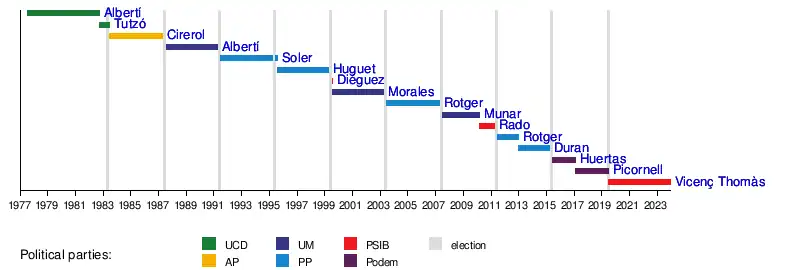 During the five years of its existence, the institution had two presidents. Jeroni Albertí (UCD) resigned in 1982 before participating in the foundation of Majorcan Union (UM).[8] The Menorcan Francesc Tutzó (UCD), who had been the vice-president, replaced Albertí, and governed the body until the 1983 regional election.[9]